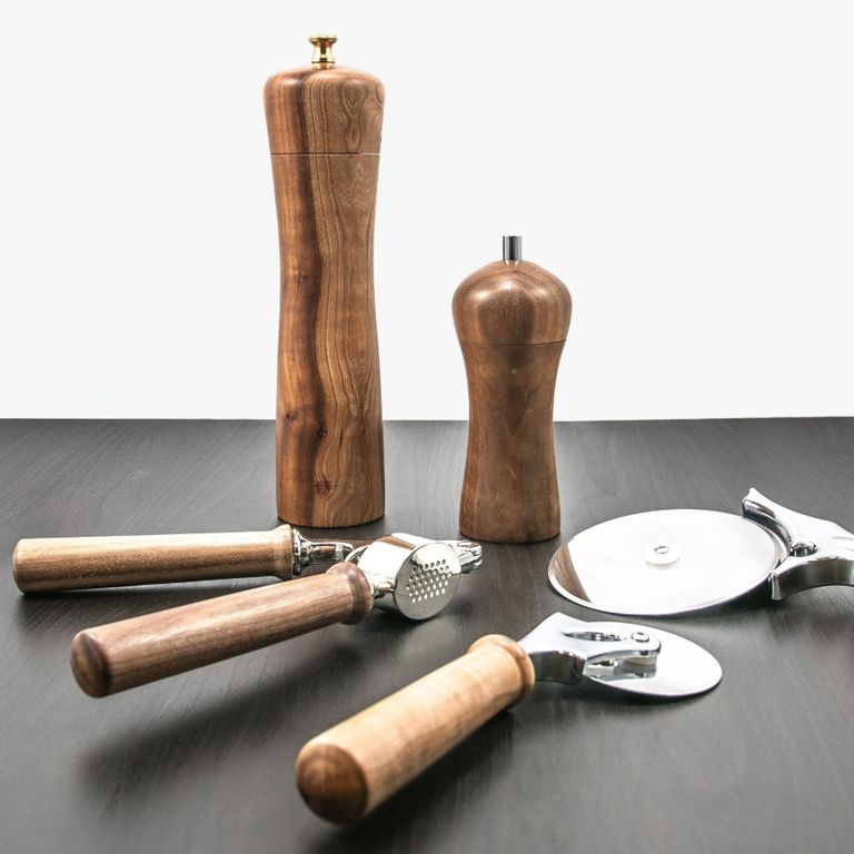 In Handarbeit gedrechselte Küchenhelfer aus regionalen Hölzern wie Pizzaschneider, Eislöffel, Salz- + Pfeffermühlen, Nussknacker, Flaschenöffner, Muskatreiben u.v.a.m