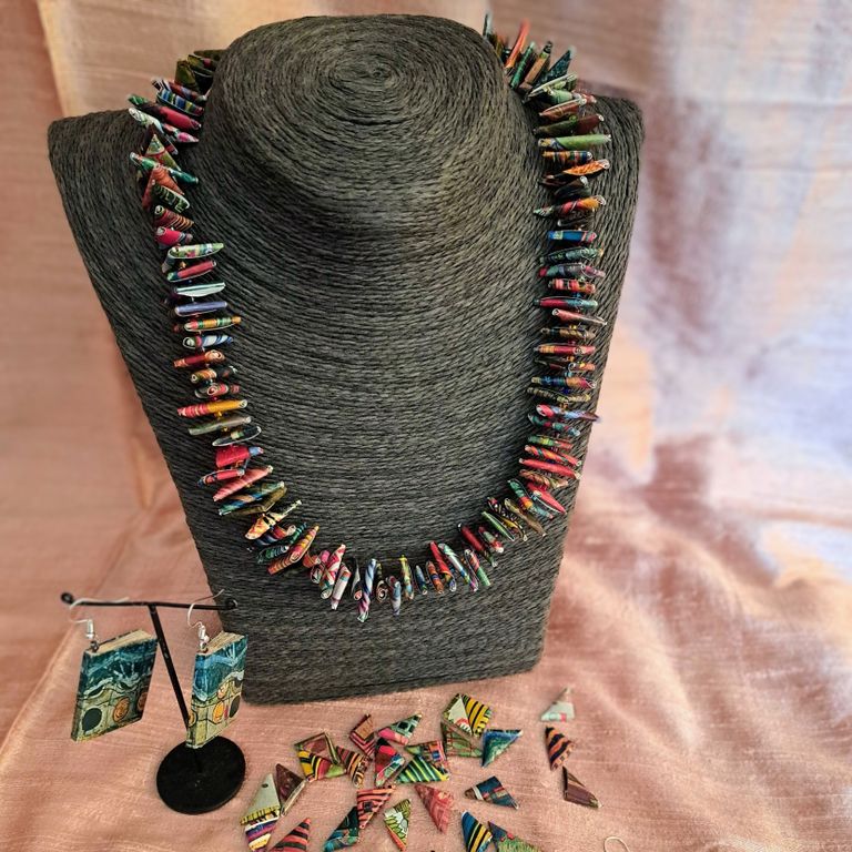 Kunst aus alten Büchern und Kalenderblättern: Halskette und Ohrhänger aus mit der Hand gefalteten Elementen - schön und hundertwasserbunt