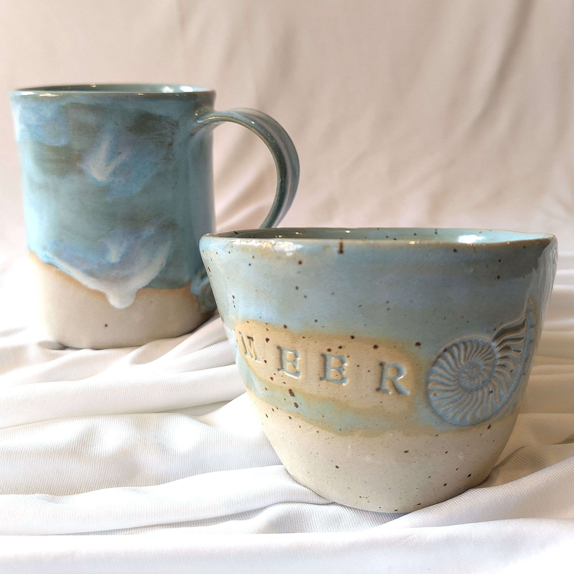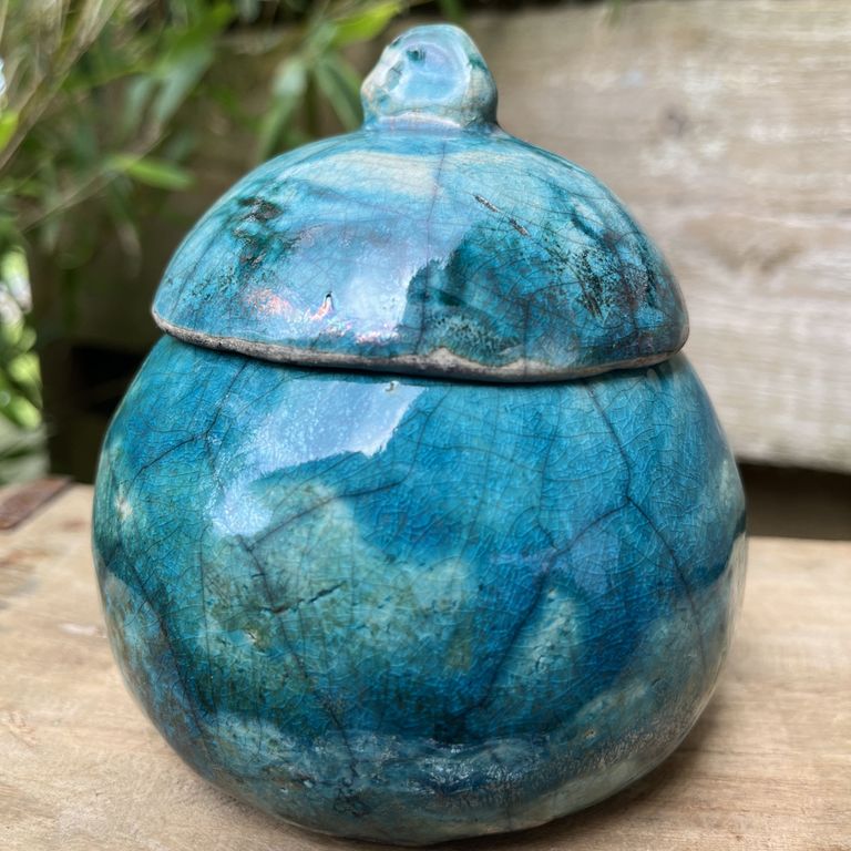 Keramik aus der freien Hand gebaut: Becher, Butterdosen, Schalen, Vasen; Rakukeramik. Glasuren sind lebensmittelecht, bleifrei, Ton aus Deutschland