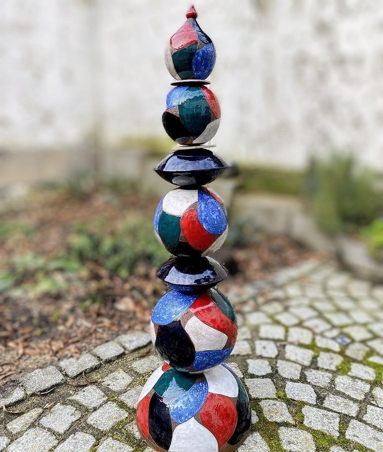 Farbenfrohe Keramiken für den Innen- und Außenbereich, auch Raku-Keramik und frostfeste Pflanzgefäße und Gartenstelen