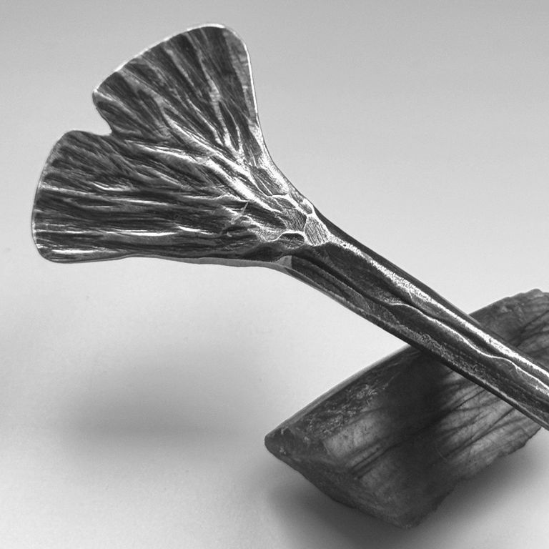 Halsschmuck, Armreife, Ringe mit offener Ringschiene, Ohrhänger, auch Haarspangen und Haarnadeln aus Edel- und Damaststahl, handgeschmiedet
