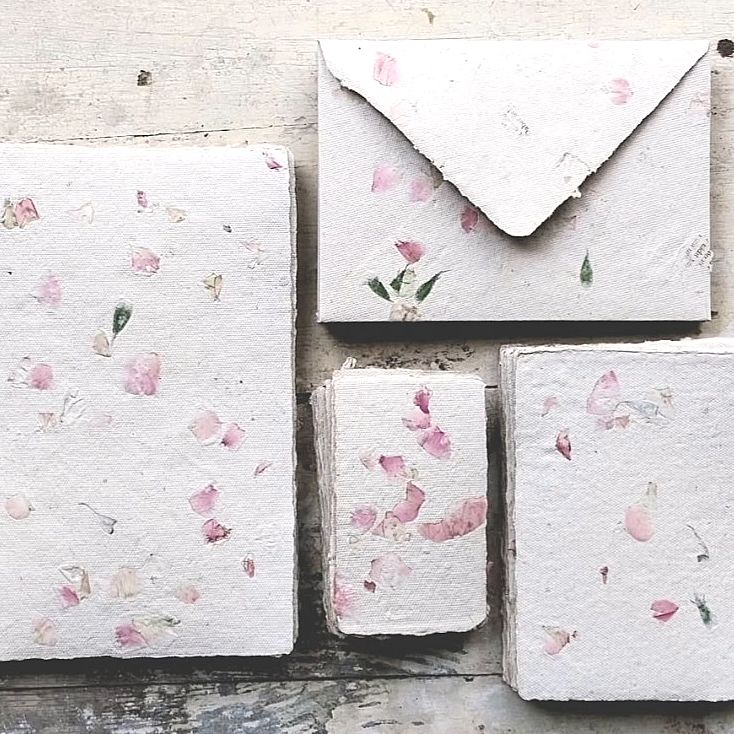 Skizzen-, Notiz-, Tagebücher, Karten und Umschläge mit/aus handgeschöpftem Papier, natürlichen Pigmenten, Blüten, Blättern; frei von Acrylfarben & Leim, normal beschreibbar