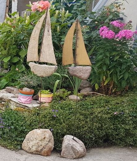 "Gartenschiffe" aus Feldsteinen und Altholz; auf Federstahl fixiert wiegt sich das Schiff sanft im Wind hin und her